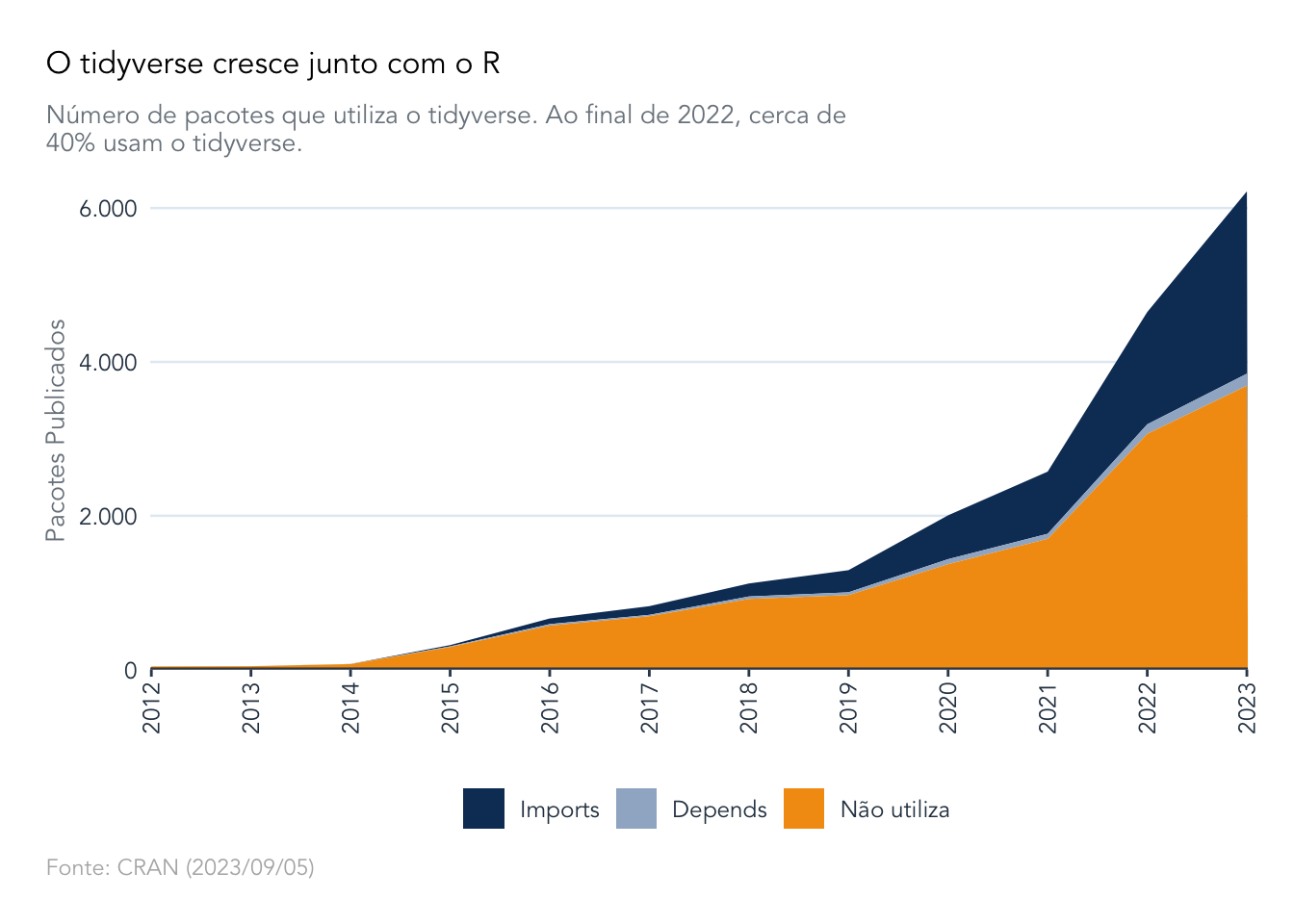 A presença de pacotes do tidyverse é crescente, chegando a mais de 40% em 2023.