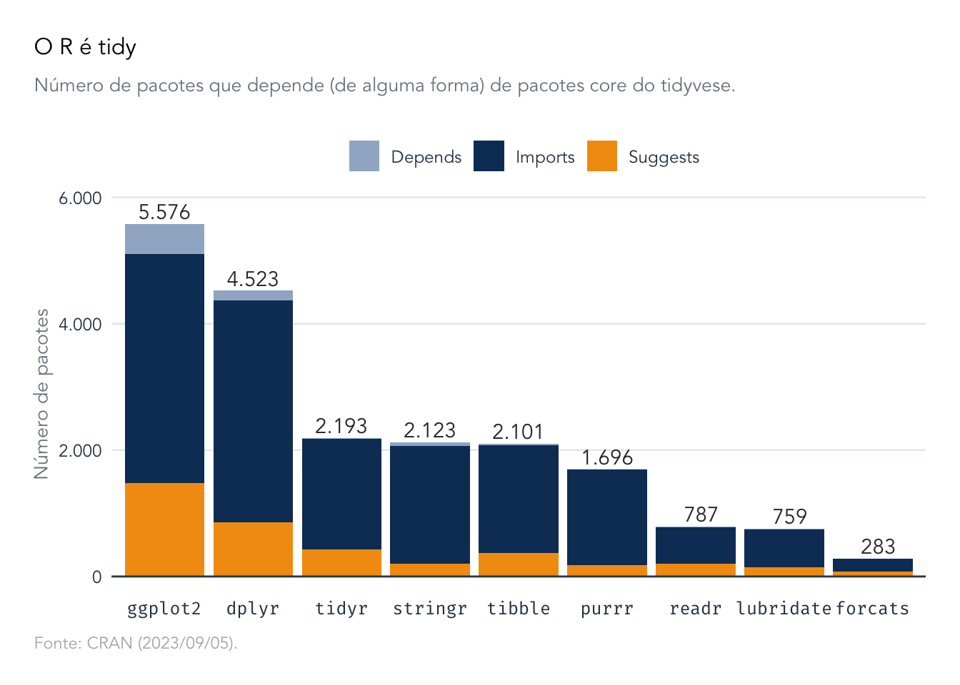 Olhando para as estatísticas do CRAN, vê-se que os pacotes do tidyverse são muito relevantes dentro do ecossistema. Os dados compilados abaixo mostram o retrato dos pacotes do CRAN em 05 de setembro de 2023, quando havia cerca de 19.800 pacotes ativos.
