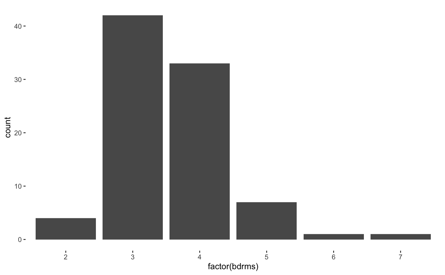 A função aes() é a que transforma as variáveis (as colunas da base de dados) em elementos visuais. Neste caso ele vai transformar o número de dormitórios em algum elemento visual. Escolhemos aes(x = factor(bdrms)). Aqui, a função factor é opcional, mas fortemente recomendada. Ela força a variável bdrms a se comportar como uma variável categórica (ao invés de uma variável contínua).