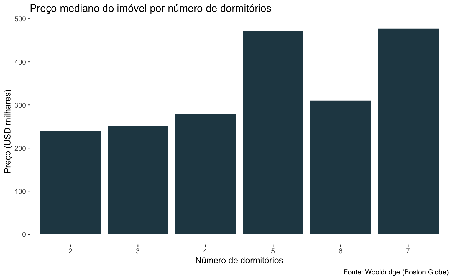 A coluna bdrms indica o número de dormitórios do imóvel. Podemos contar o número de imóveis pelo número de dormitórios usando a função geom_bar().