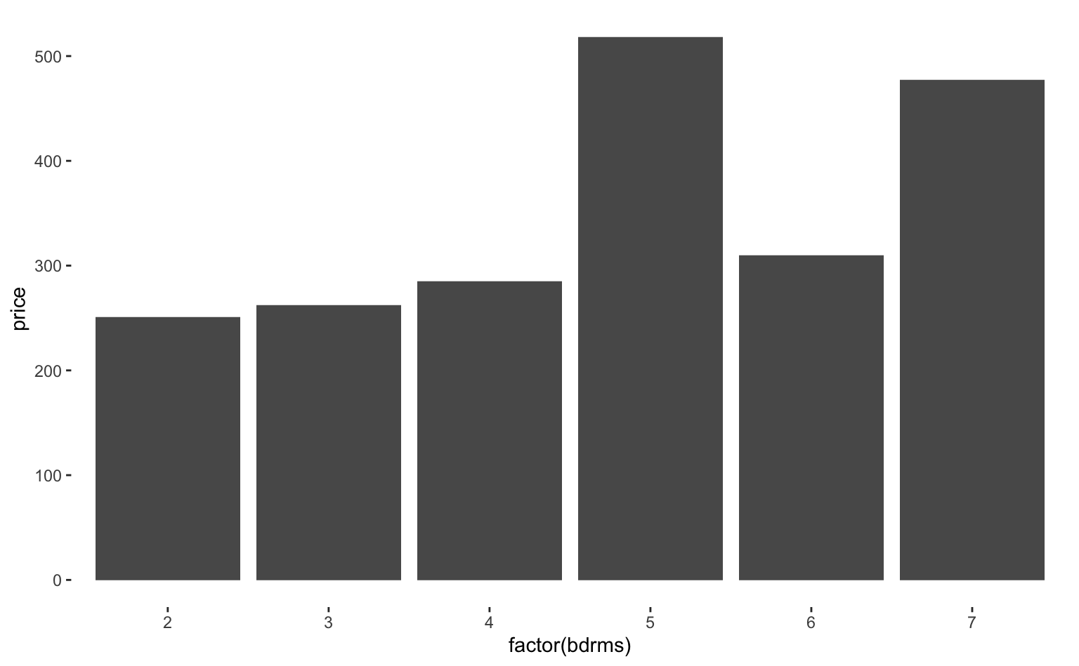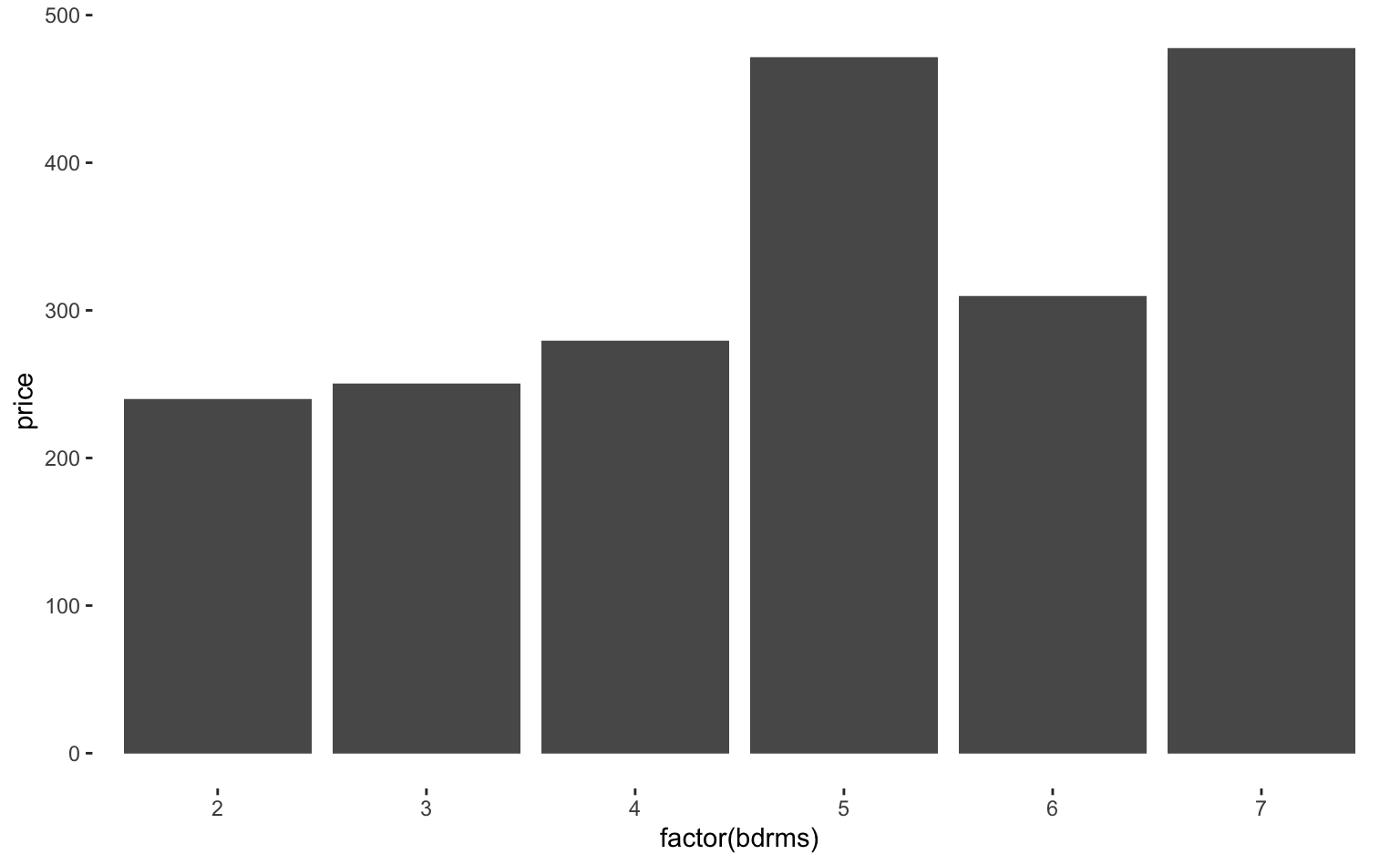ggplot(data = hprice1, aes(x = factor(bdrms), y = price)) +