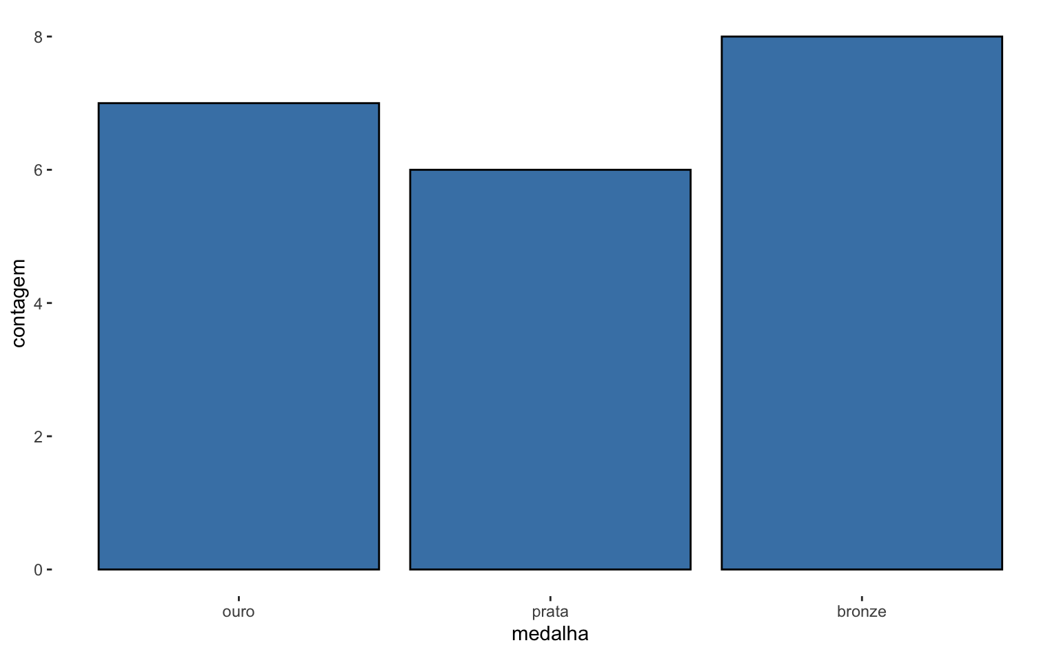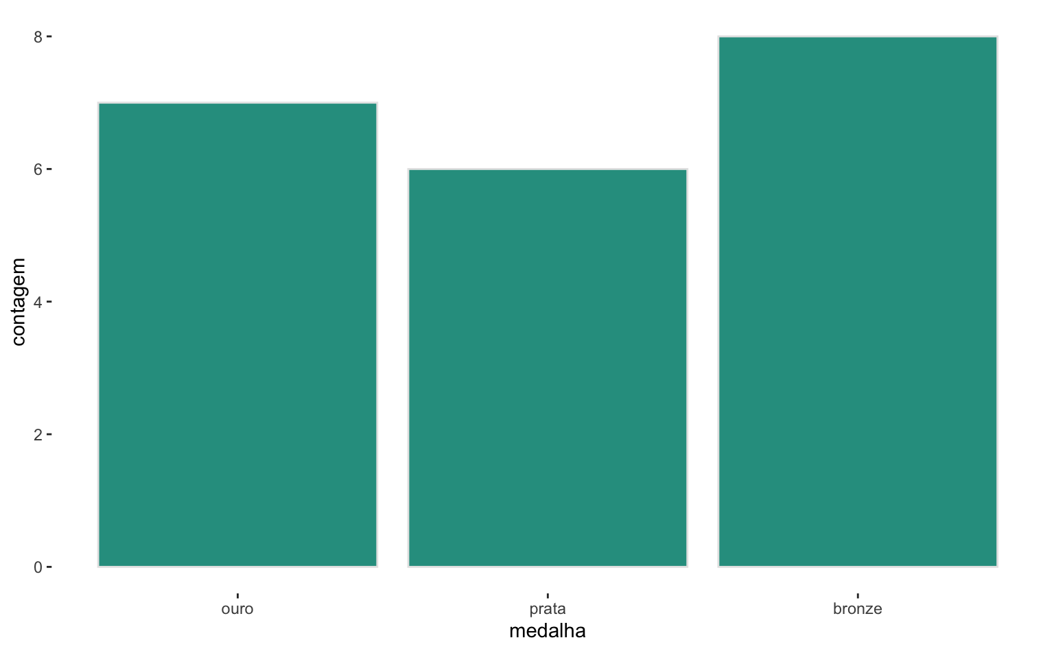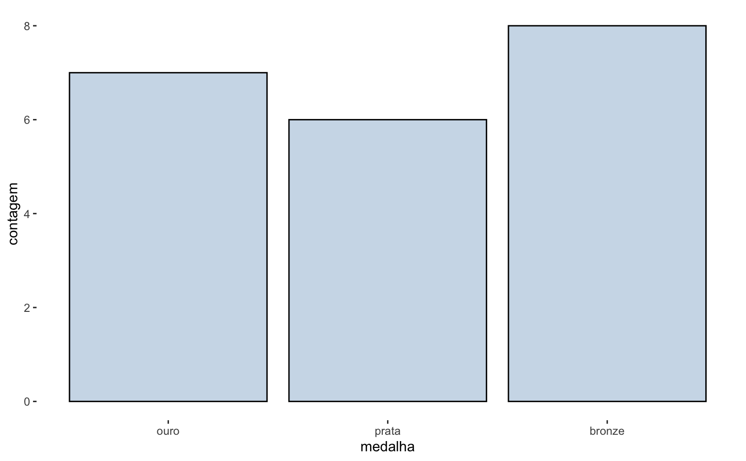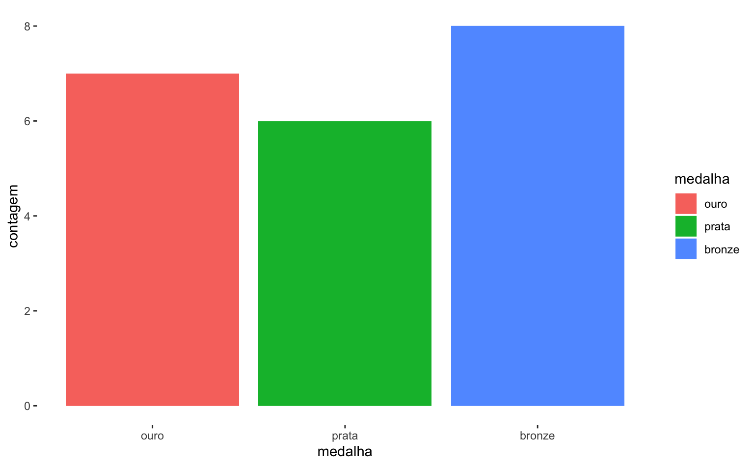Na última Olimpíada, o Brasil obteve 7 medalhas de ouro, 6 de prata e 8 de bronze. O código abaixo estrutura estes dados num data.frame. Aqui a função factor ajuda a organizar os dados, pois impõe uma ordem de grandeza na variável categórica medalha.