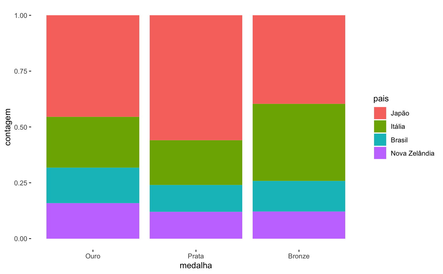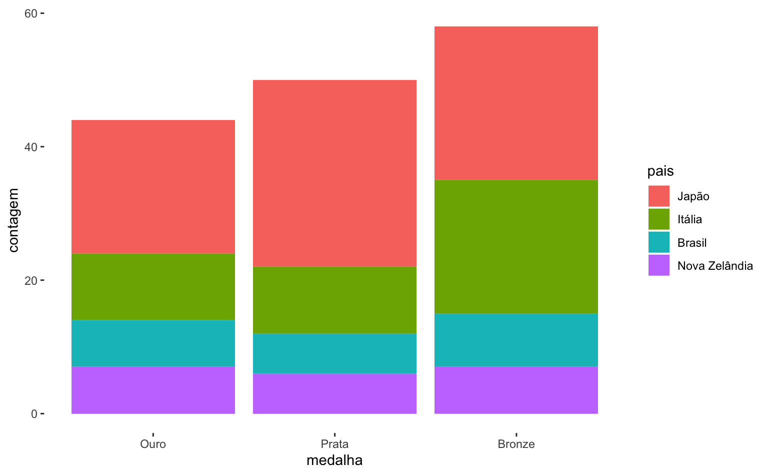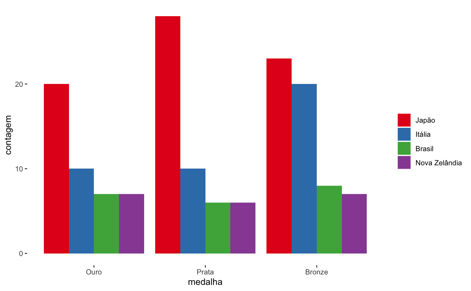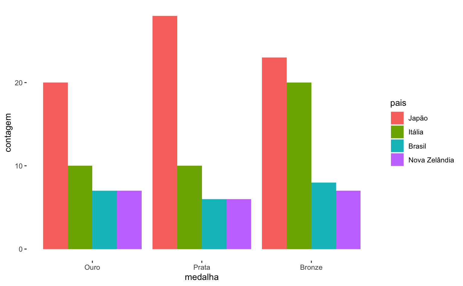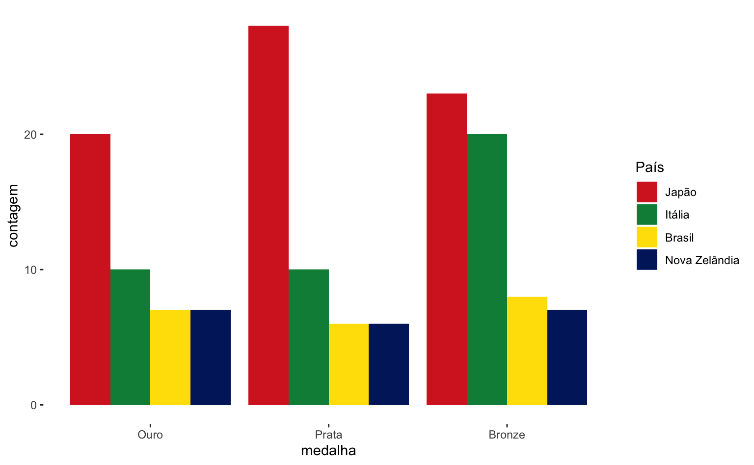 Se quiseremos ter uma visualização que represente mais diretamente a performance de cada país temos que incluir um argumento adicional position = "dodge" dentro da função geom_col(). Agora fica mais evidente, por exemplo, que o Japão teve um número grande de medalhas de prata e que o Brasil e a Nova Zelândia tiveram desempenhos muito semelhantes - o Brasil ficou na frente por causa de uma medalha de bronze.
