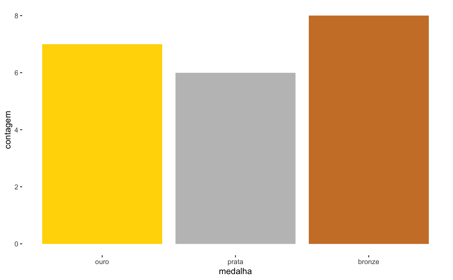 Agora o R mapeou uma cor diferente para cada valor distinto de medalha. Infelizmente, as cores padrão não nos ajudam neste caso. Podemos escolher estas cores manualmente usando a função scale_fill_manual(). O código abaixo faz este ajuste. As cores são inseridas dentro do argumento values em formato hexadecimal. Por fim, adicionamos a linha guides(fill = "none") para remover a legenda redundante.