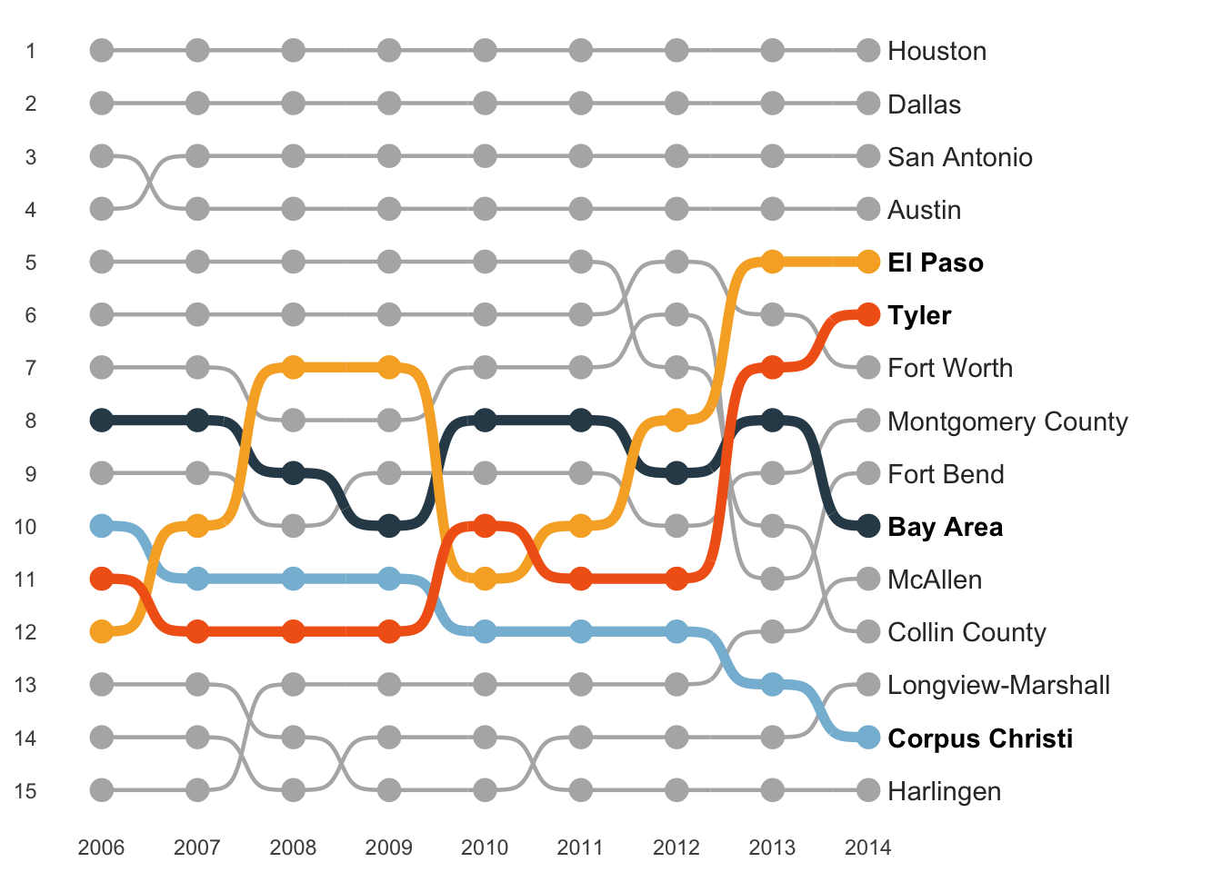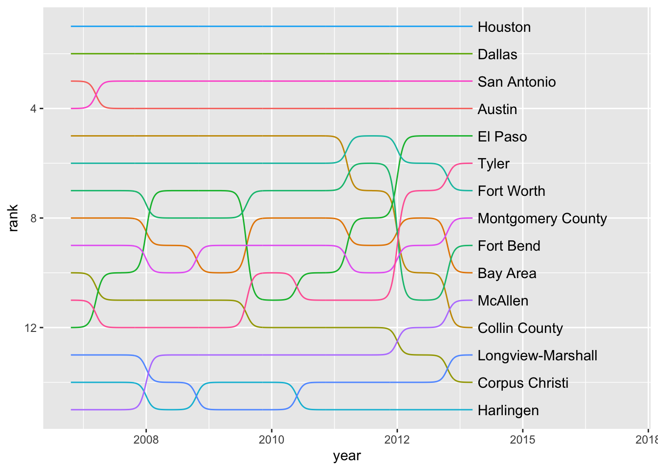 Mesmo com o nome das cidades, há muitas linhas para acompanhar no gráfico. Vamos destacar apenas algumas cidades. Em vez do top 4 (Houston, Dallas, San Antonio e Austin), que praticamente não se alternam no ranking, vamos destacar Bay Area, El Paso, Corpus Christi e Tyler.