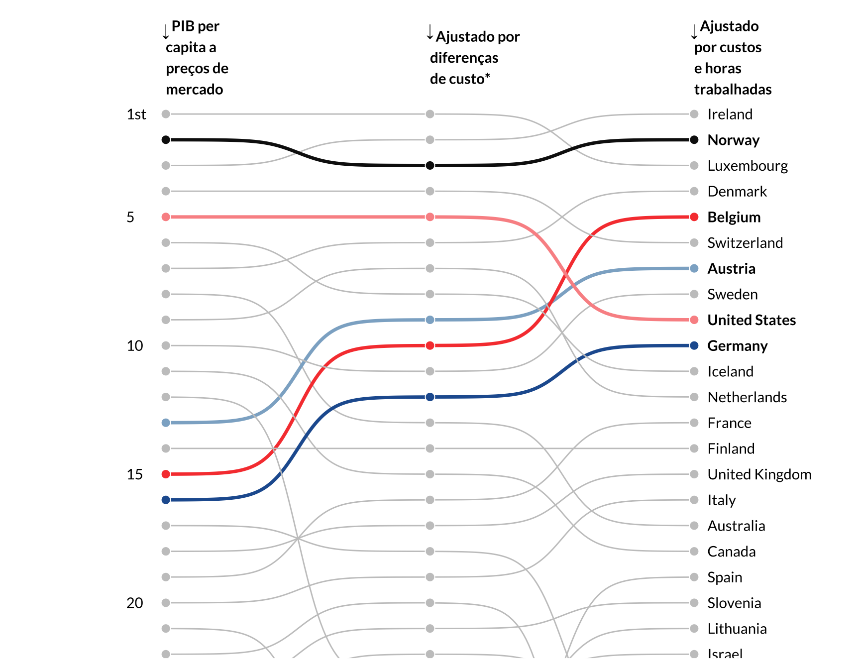 Note como esta medida eleva consideravelmente a posição de países europeus como Bélgica, Alemanha, Áustria e Dinamarca, enquanto derruba alguns países como EUA e Singapura.