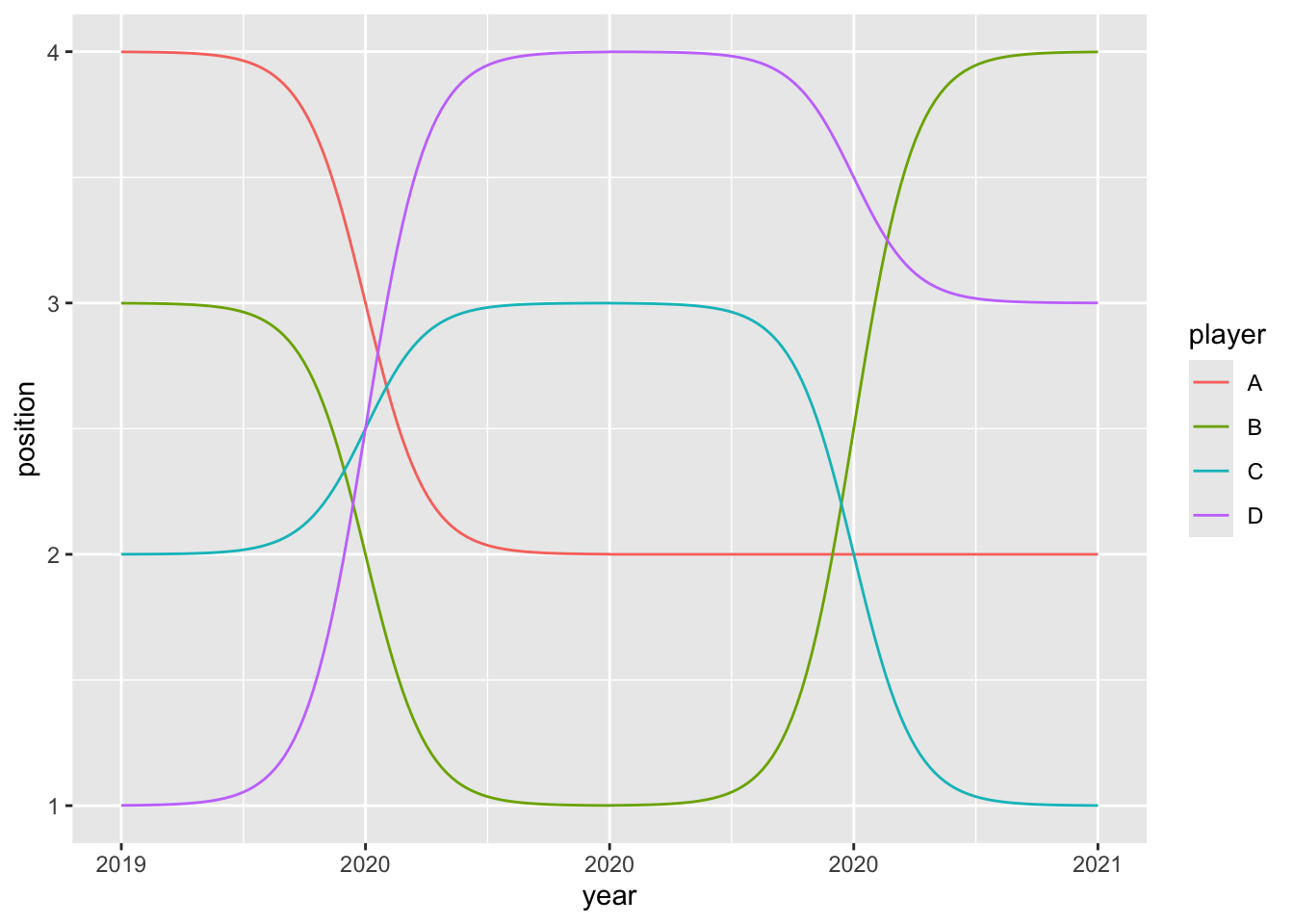 Este primeiro exemplo é emprestado da documentação do pacote e ilustra o básico da função geom_bump. Os dados devem estar em formato ‘tidy’ (longitudinal) onde as posições dos pontos são especificadas pelos argumentos x e y e os grupos identificados via estética group.