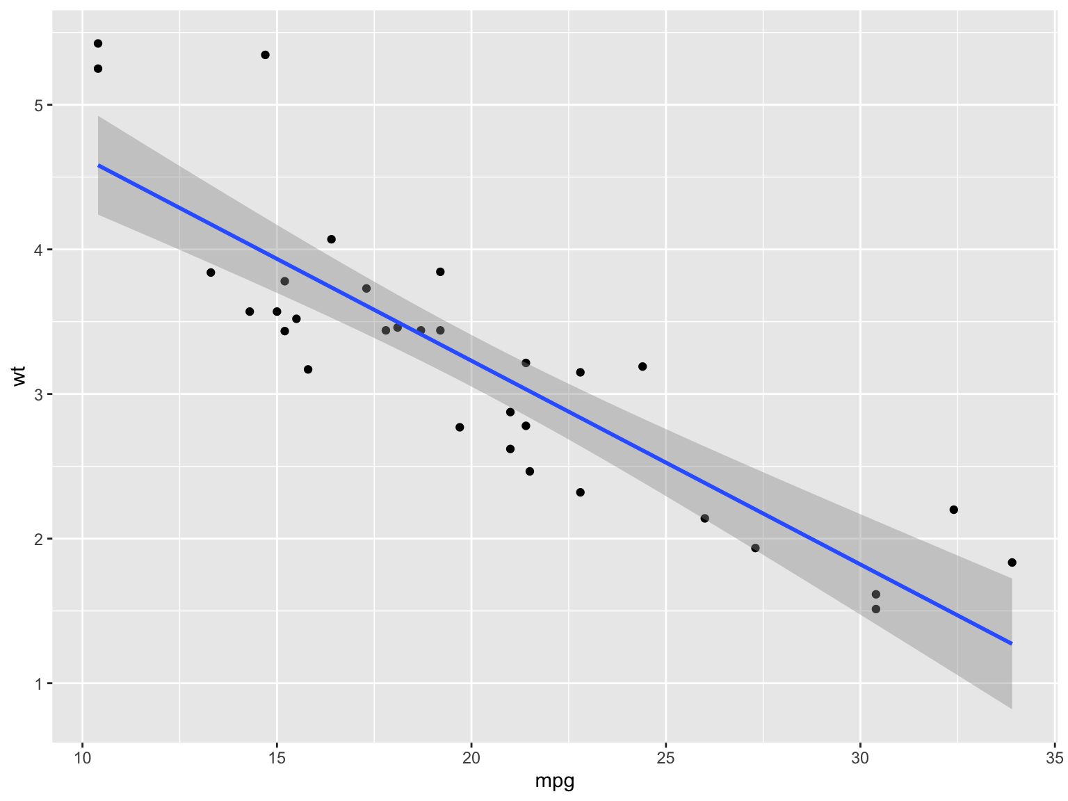 ggplot(data = mtcars, aes(x = mpg, y = wt)) + geom_point() + geom_smooth(method = "lm")