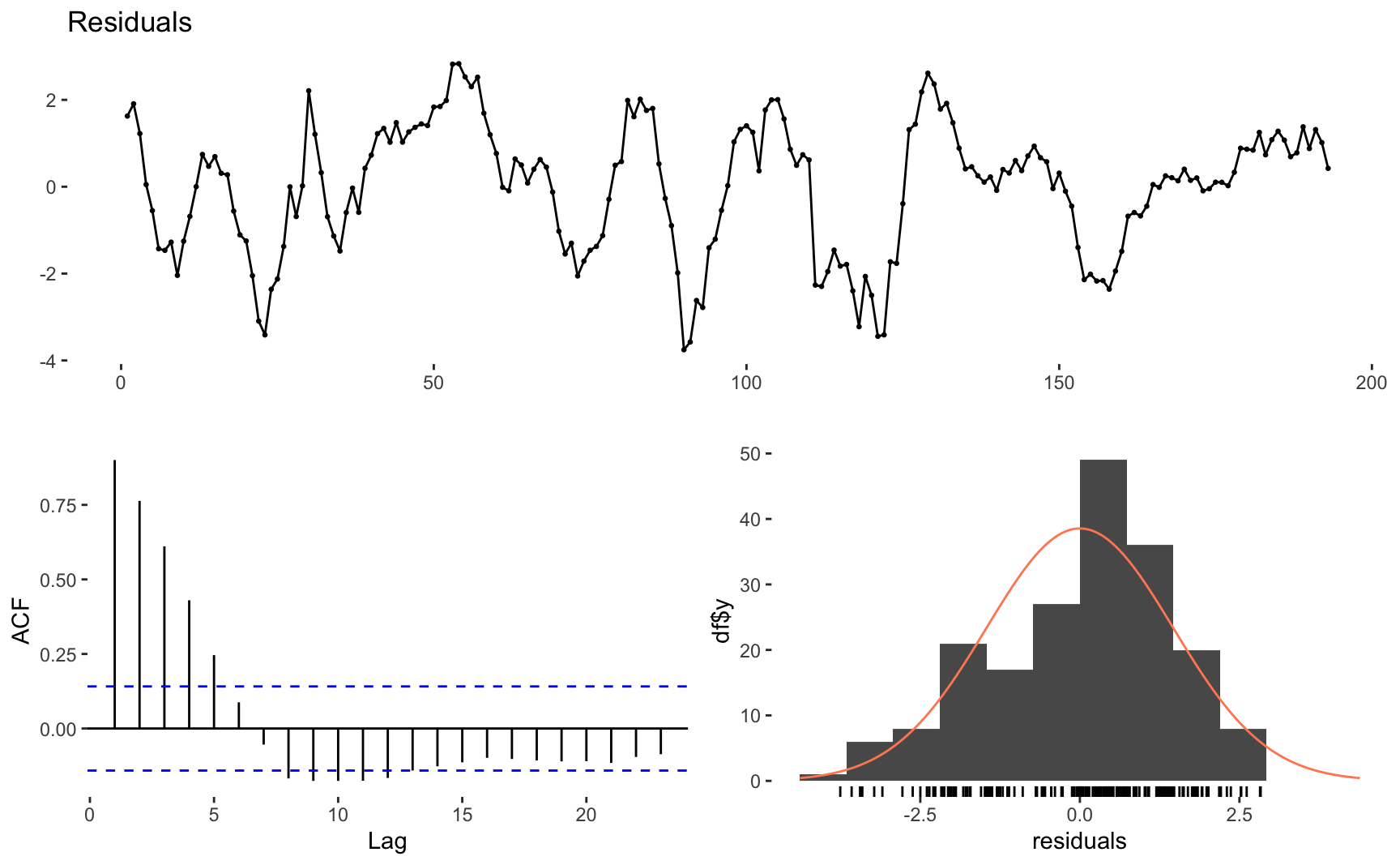 Idealmente, deve-se verificar o comportamento dos resíduos do modelo de regressão. Neste caso, estes resíduos são considerados o componente cíclico da série original. O painel abaixo mostra os resíduos da primeira série, do PIB. O gráfico de cima é simplesmente o gráfico do resíduo. No gráfico inferior-esquerdo temos o gráfico de autocorrelação da série e no gráfico inferior-direito temos o historgrama dos resíduos com a densidade da distribuição normal superimposta.