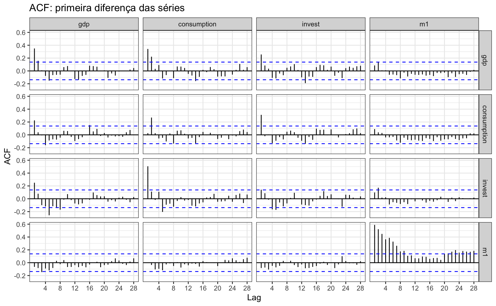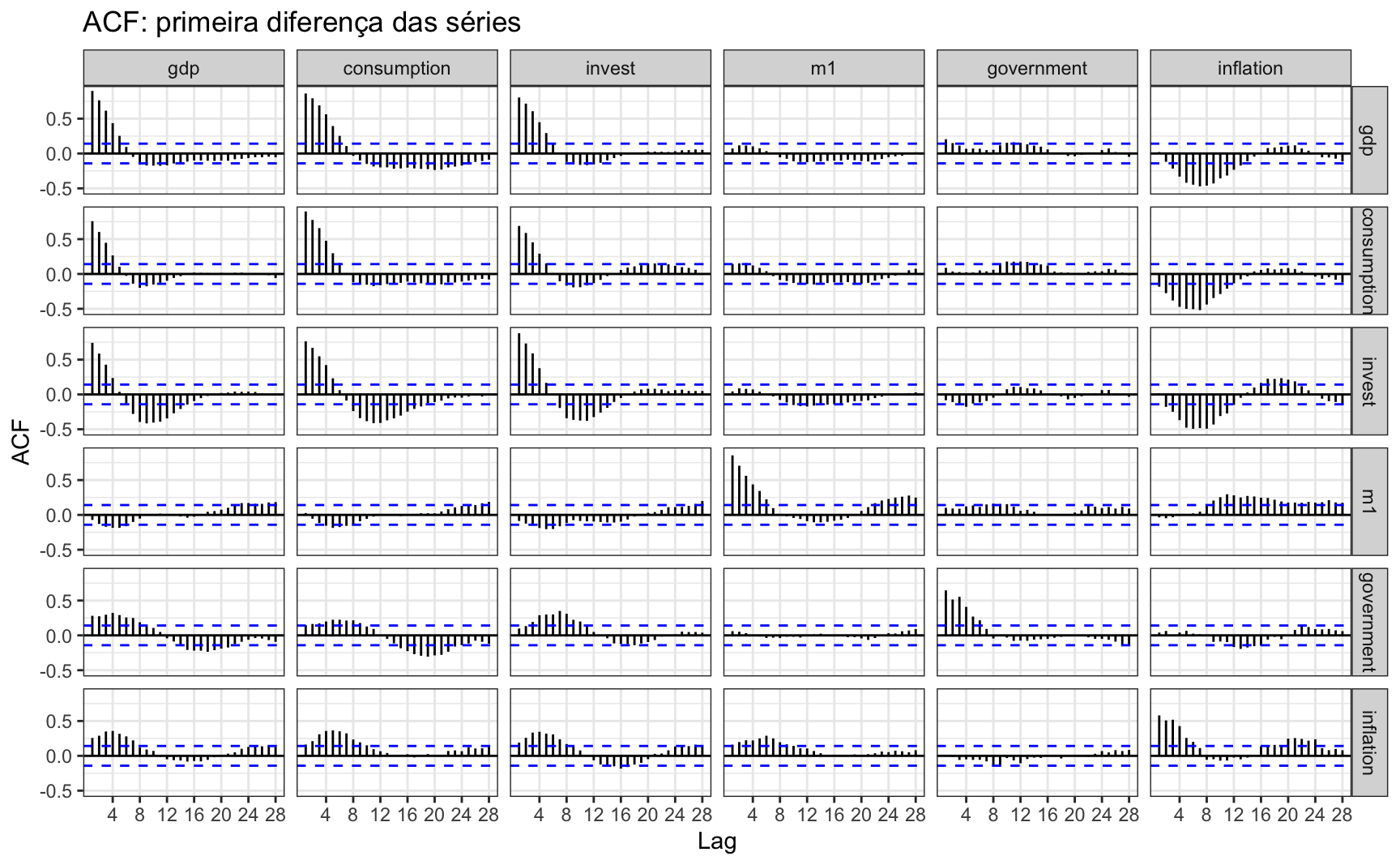 Evidentemente, não é fácil inspecionar os resíduos de todos os modelos, especialmente quando o número de séries é muito grande. O painel abaixo mostra o gráfico de autocorrelação entre as seis séries consideradas. Na diagonal principal temos o gráfico do resíduo da própria série; nos demais gráficos, mostra-se a autocorrelação cruzada entre os resíduos.