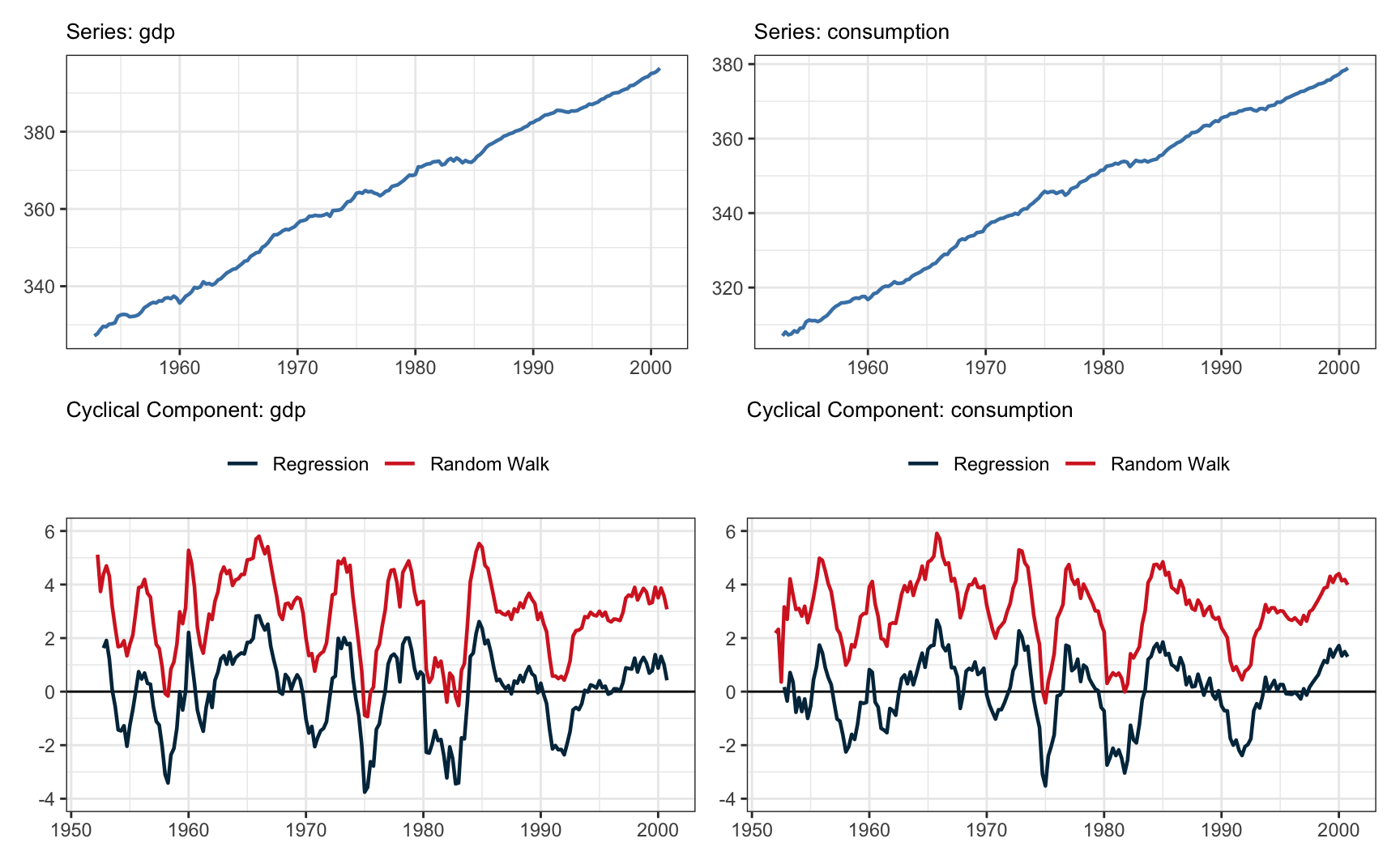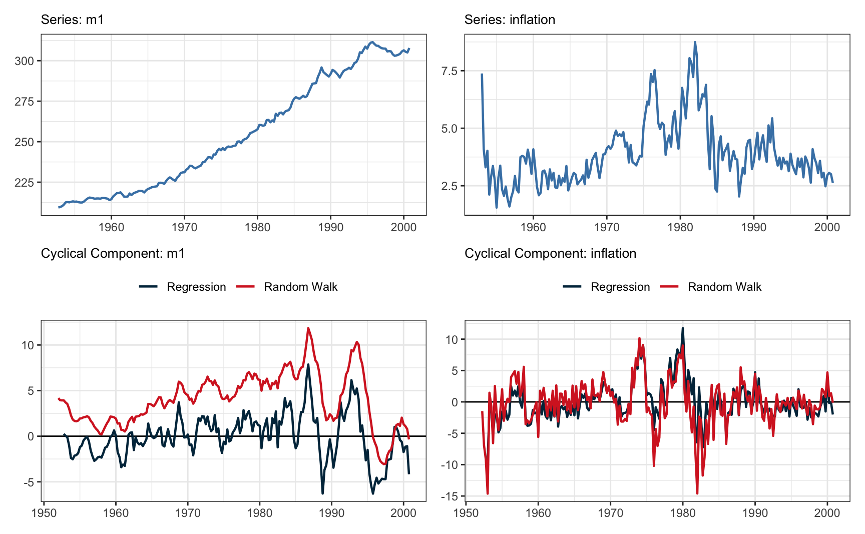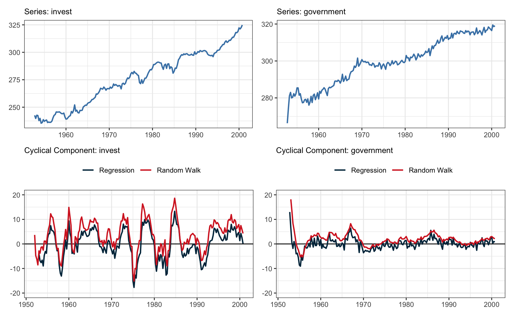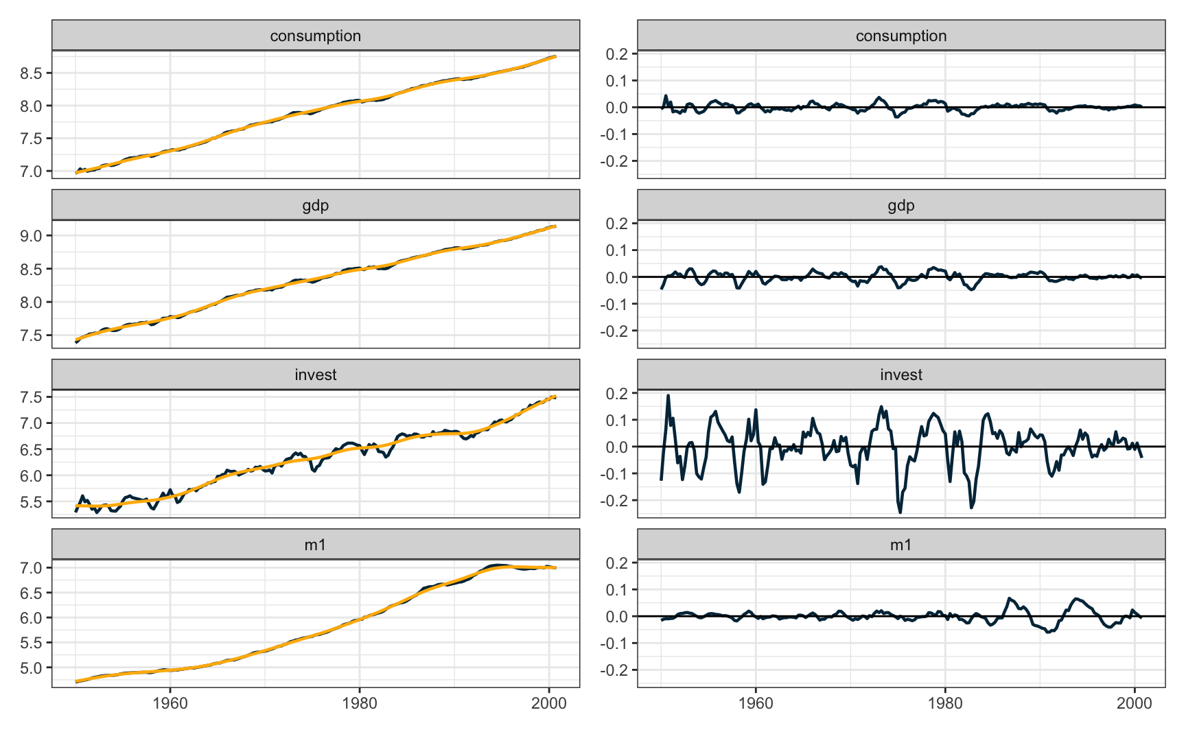 Para um exemplo mais aplicado, vamos usar a base USMacroG do pacote {AER}. O código abaixo aplica o filtro HP sobre o logaritmo das séries trimestrais do PIB, consumo, investimento e M1. As séries são todas completas com 204 observações entre 1950 e 2000.