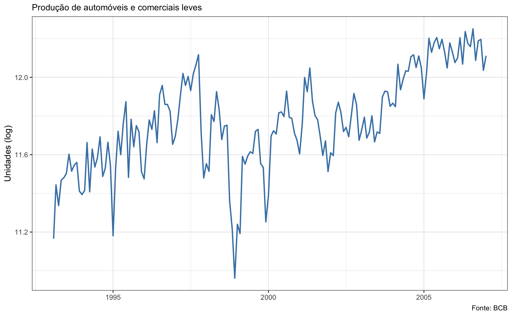 O gráfico abaixo mostra a produção de automóveis no Brasil entre 1993 e 2007. Os dados são da Anfavea e baixados no R via API do Banco Central. A série não foi ajustada sazonalmente.