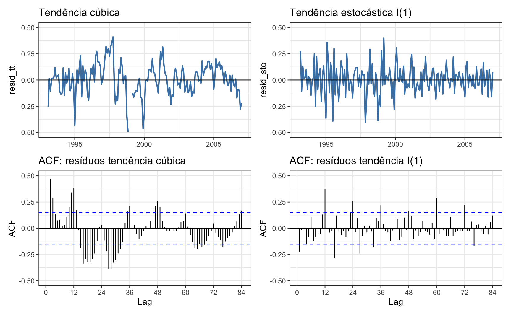 O painel abaixo mostra as séries sem tendência e o gráfico de autocorrelação do resíduo do ajuste. Note que é possível perceber visualmente a presença de uma componente sazonal que permanece na série. Os resíduos do ajuste com polinômio de terceiro grau ainda apresentam bastante autocorrelação, sugerindo que a série não é tendência-estacionária. O ajuste na primeira diferença parece ser mais adequado neste caso.