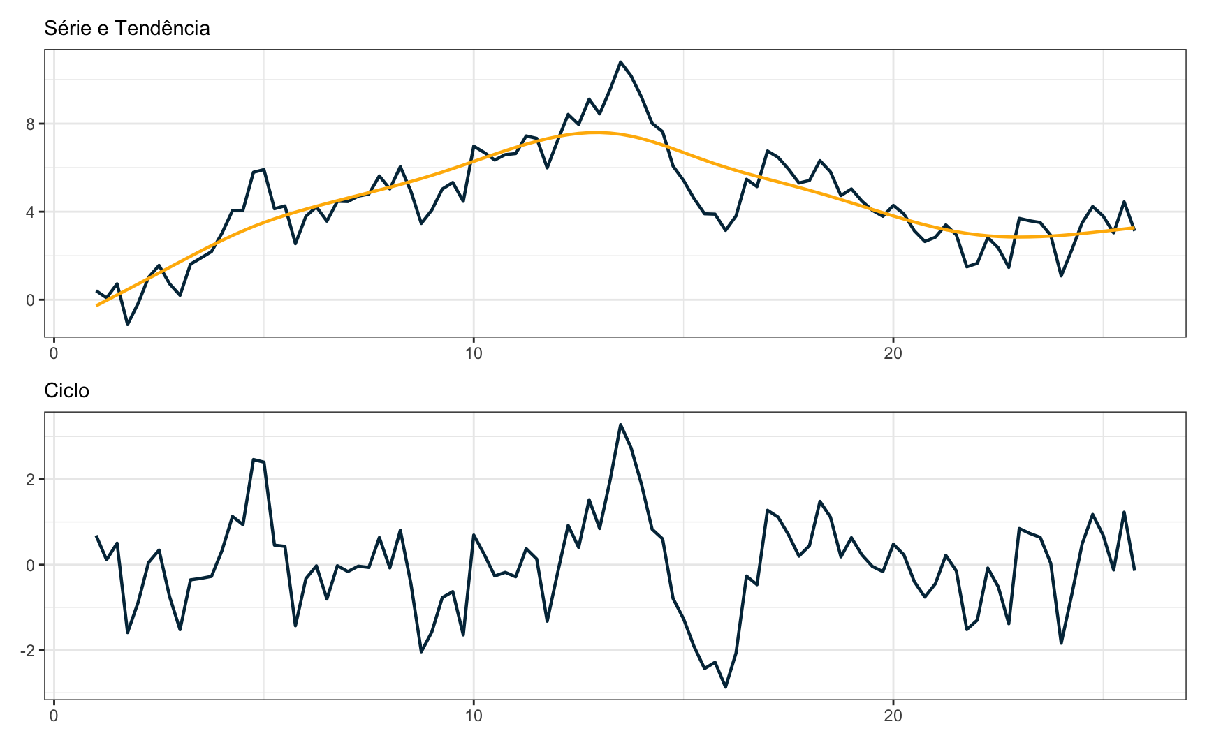 Uma abordagem bastante comum para encontrar a tendência/ciclo em séries macroeconômicas é o filtro Hodrick-Prescott (HP). O filtro HP separa uma série em suas componentes de tendência e ciclo. Sua formulação matemática baseia-se na minimização de uma função objetivo que busca encontrar uma estimativa suave da tendência subjacente, ao mesmo tempo em que penaliza variações abruptas.