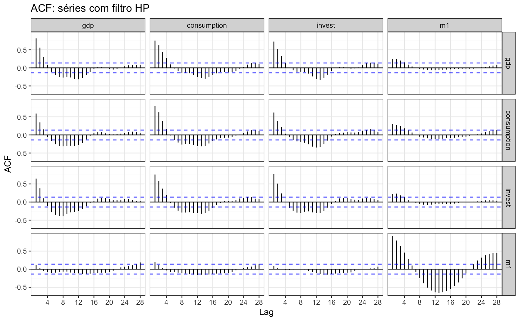 Se tivéssemos assumido, contudo, que as séries são I(1), não haveria muita correlação cruzada entre as séries.