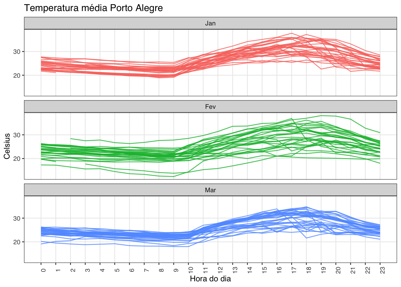 labs(title = "Temperatura média Porto Alegre", x = "Hora do dia", y = "Celsius") +