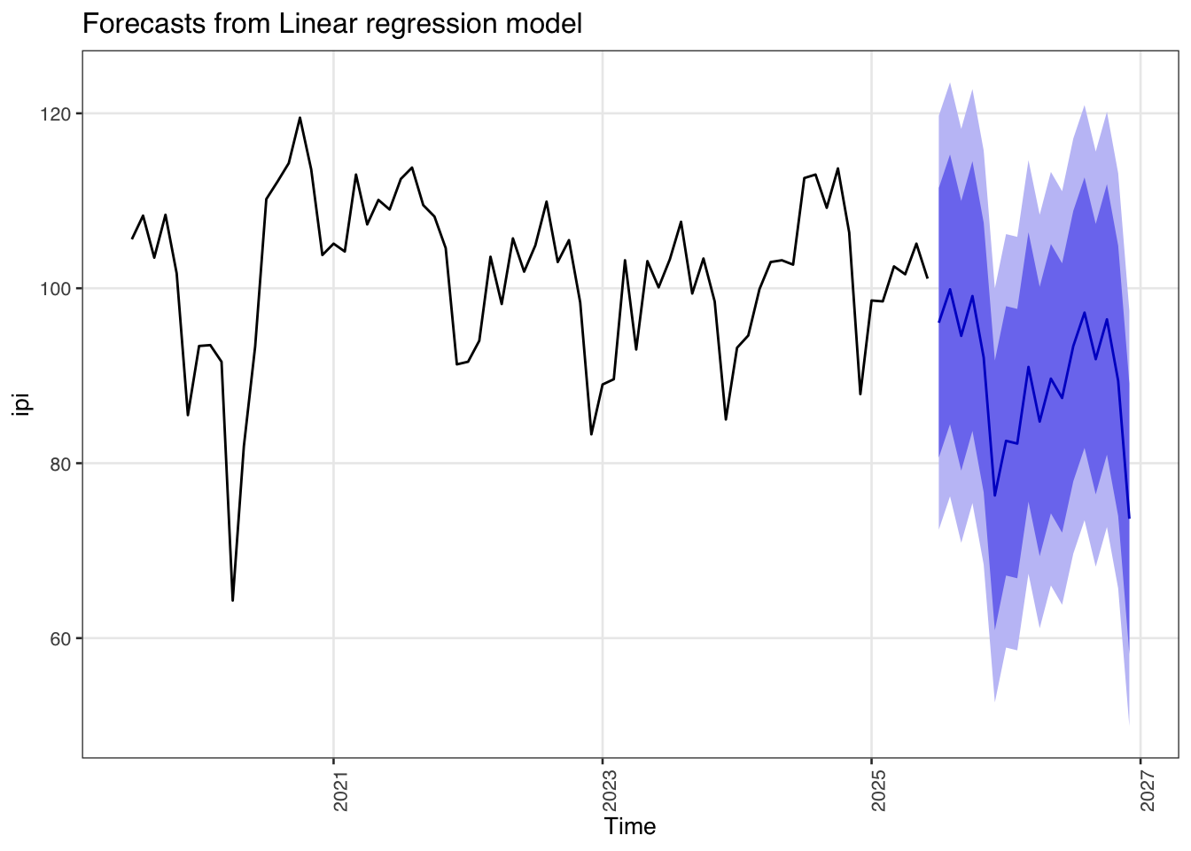 model_lm <- tslm(ipi ~ trend + season)| Characteristic | Beta | 95% CI | p-value |