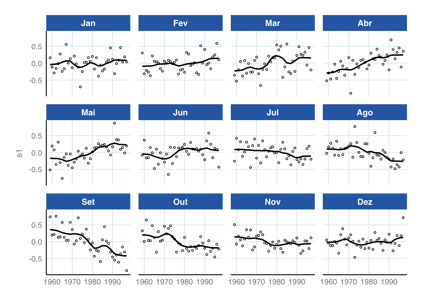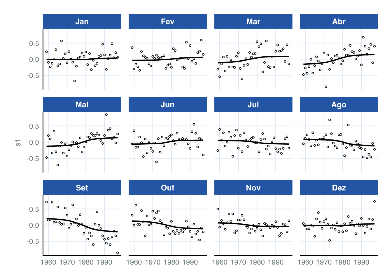 Relativamente ao mês base (janeiro), os meses de julho a agosto exibem valores positivos de maior magnitude. Isto corrobora a inspeção visual, que apontava que estes meses eram um “período de alta”. Além disso, o modelo estima uma tendência linear e negativa, sinalizando a queda dos valores da série ao longo do tempo.
