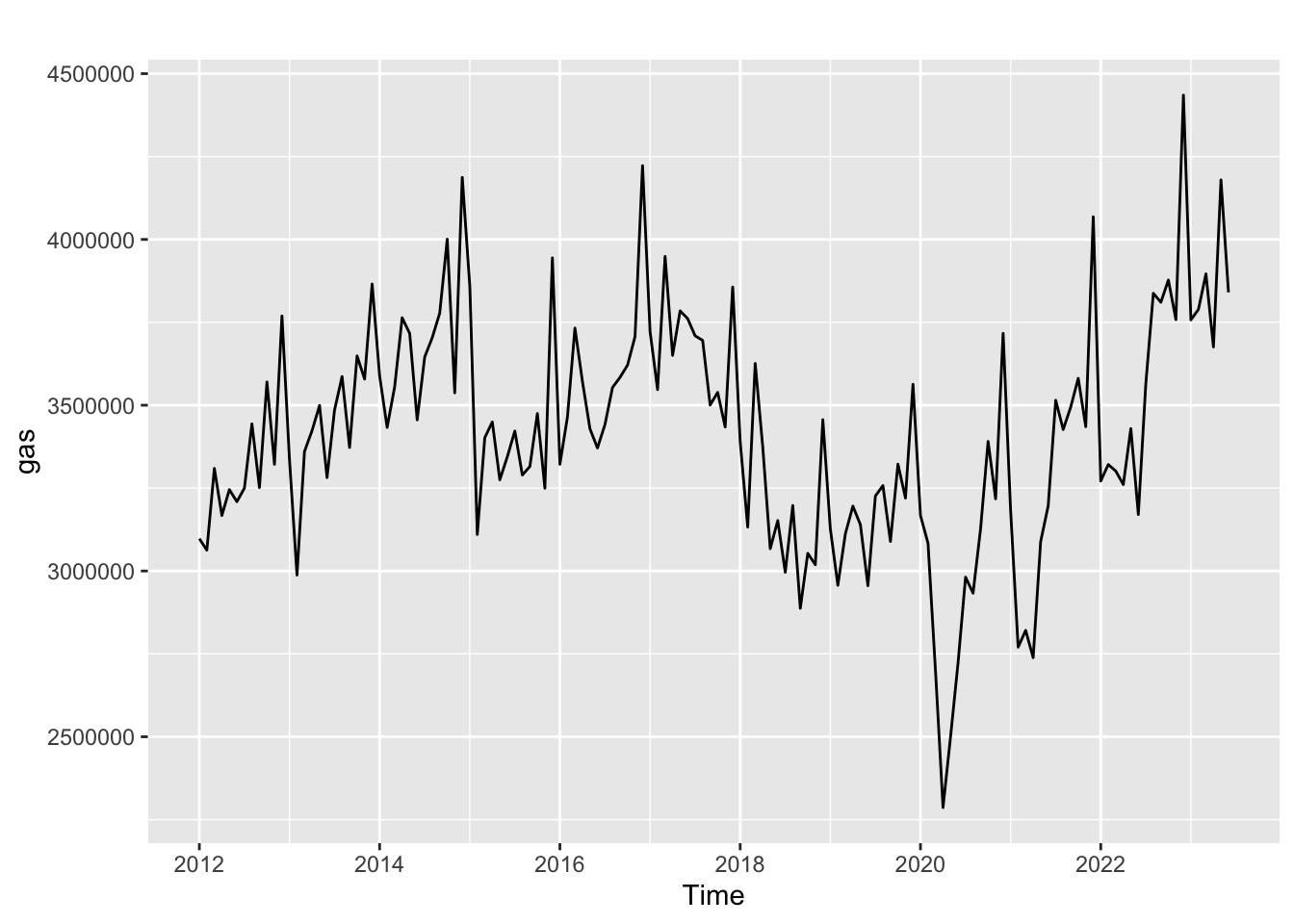 gasolina = read_csv("...")gas = ts(na.omit(gasolina$demand), start = c(2012, 1), frequency = 12)