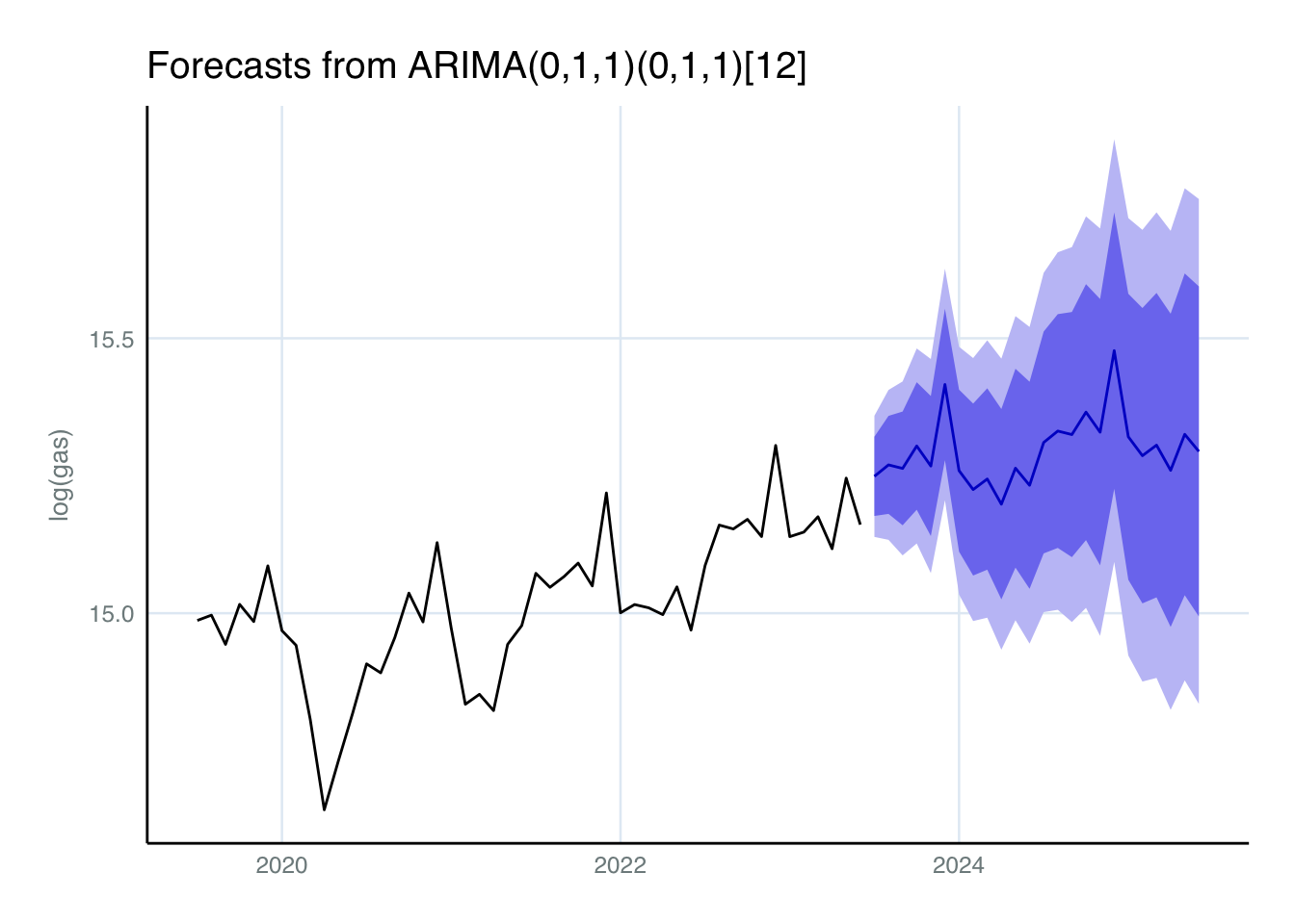 sarima_model = Arima(log(gas), order = c(0, 1, 1), seasonal = c(0, 1, 1))
