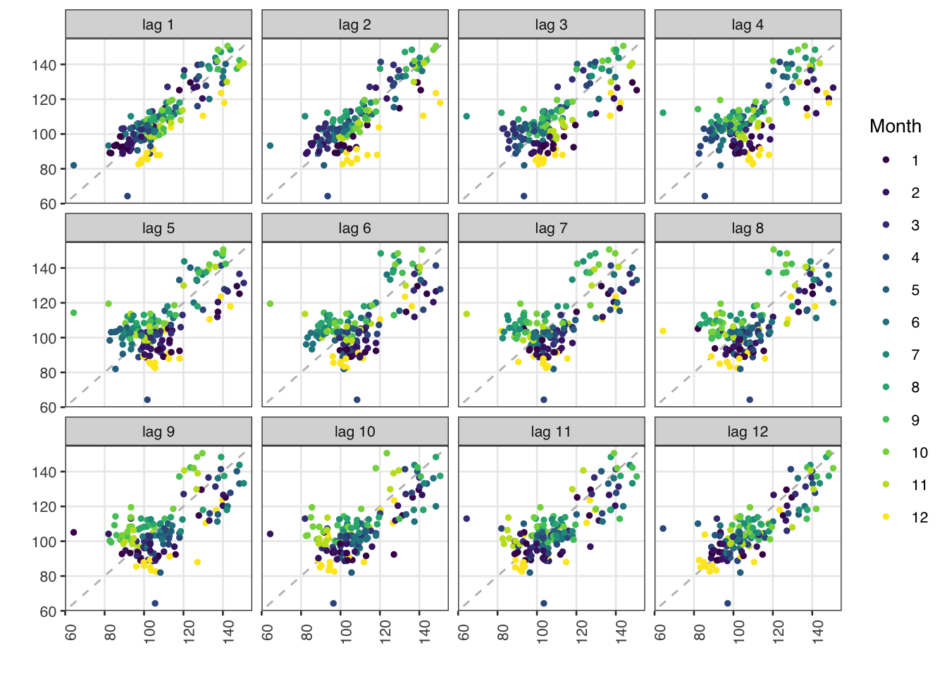 gglagplot(ipi, seasonal = TRUE, do.lines = FALSE, lags = 12) +