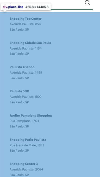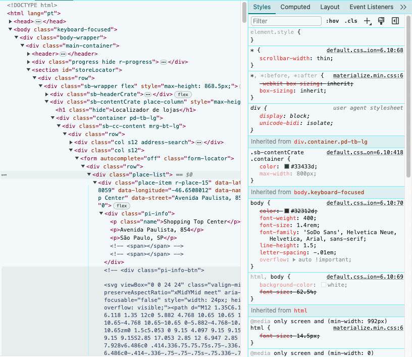 Para encontrar a grande lista de lojas no painel da esquerda vamos aproveitar o fato de que o div que guarda esta lista tem uma classe única chamada “place-list”. É fácil verificar isto no próprio navegador. Se você usar o Chrome, por exemplo, basta clicar com o botão direito sobre o painel e clicar em Inspect.